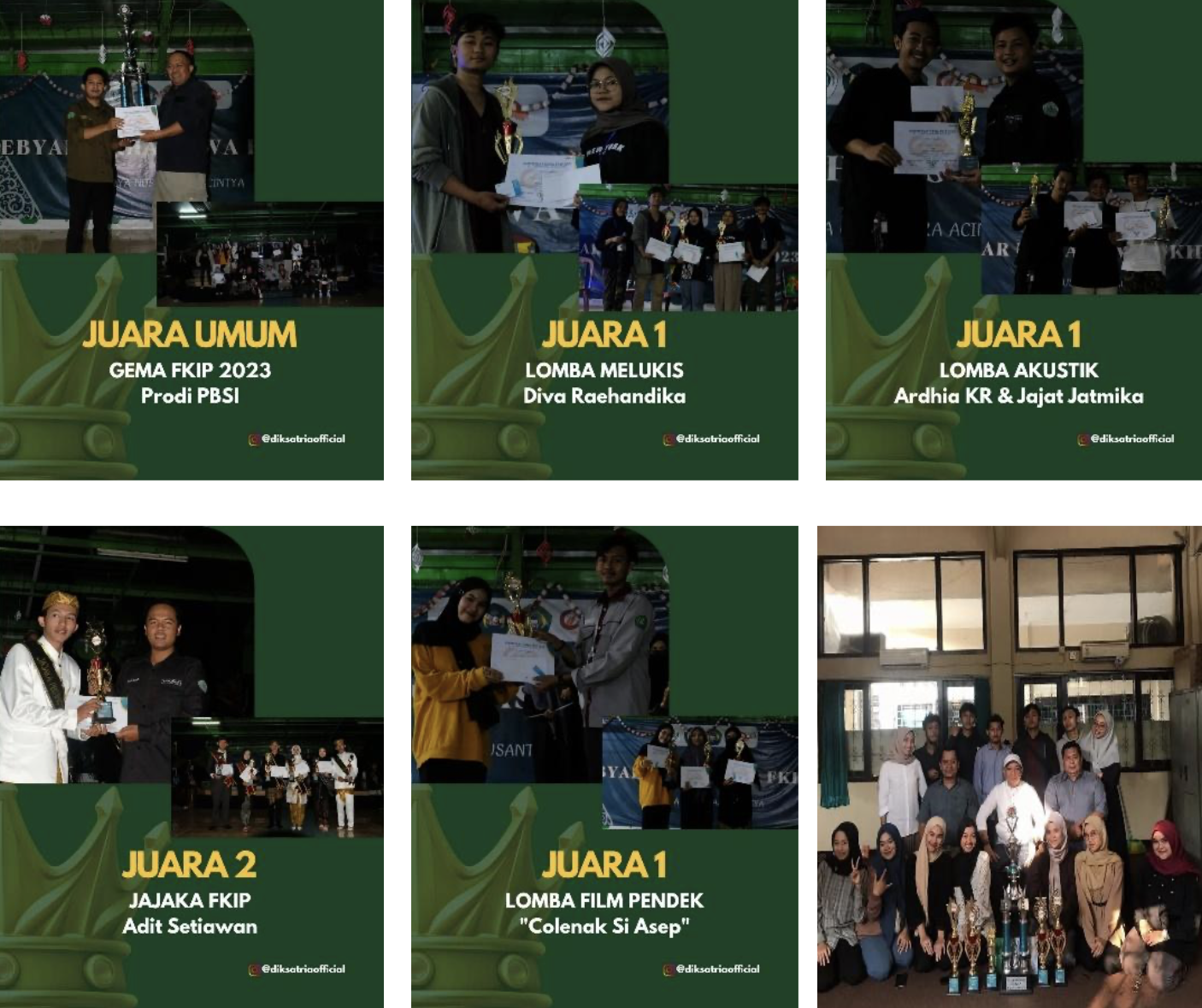 ![]() | ● Juara 2 Jajaka FKIP – Adit Setiawan ● Juara 1 lomba Film Pendek “Colenak Si Asep” – Annisa Farida, dkk ● Juara 1 Lomba Akustik – Ardhia dan Jajat ● Juara 1 Lomba melukis – Diva Raehandika | Juara Umum GEMA FKIP 2023 |